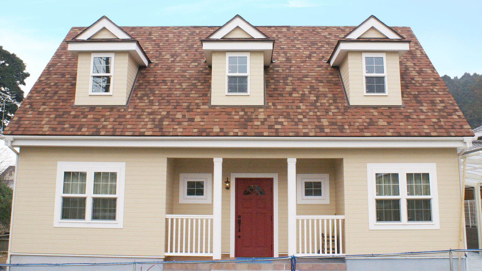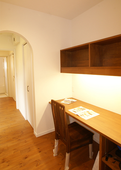 家族の気配を感じられるプラン。限られた大きさの中で、家族との繋がりがポイントとなりました。リビング、ダイニングと繋がるオープンキッチンは、スタディーコーナーやお庭も見ることが出来るプラン。リビングの吹き抜けは開放感を出すとともに、2階のこども達の気配を感じたり、 室内の空気を循環させる役割も担っています。 インテリアは、パインの床、タイル、腰板など、奥様の思い描いたナチュラルな雰囲気の仕上りになりました。